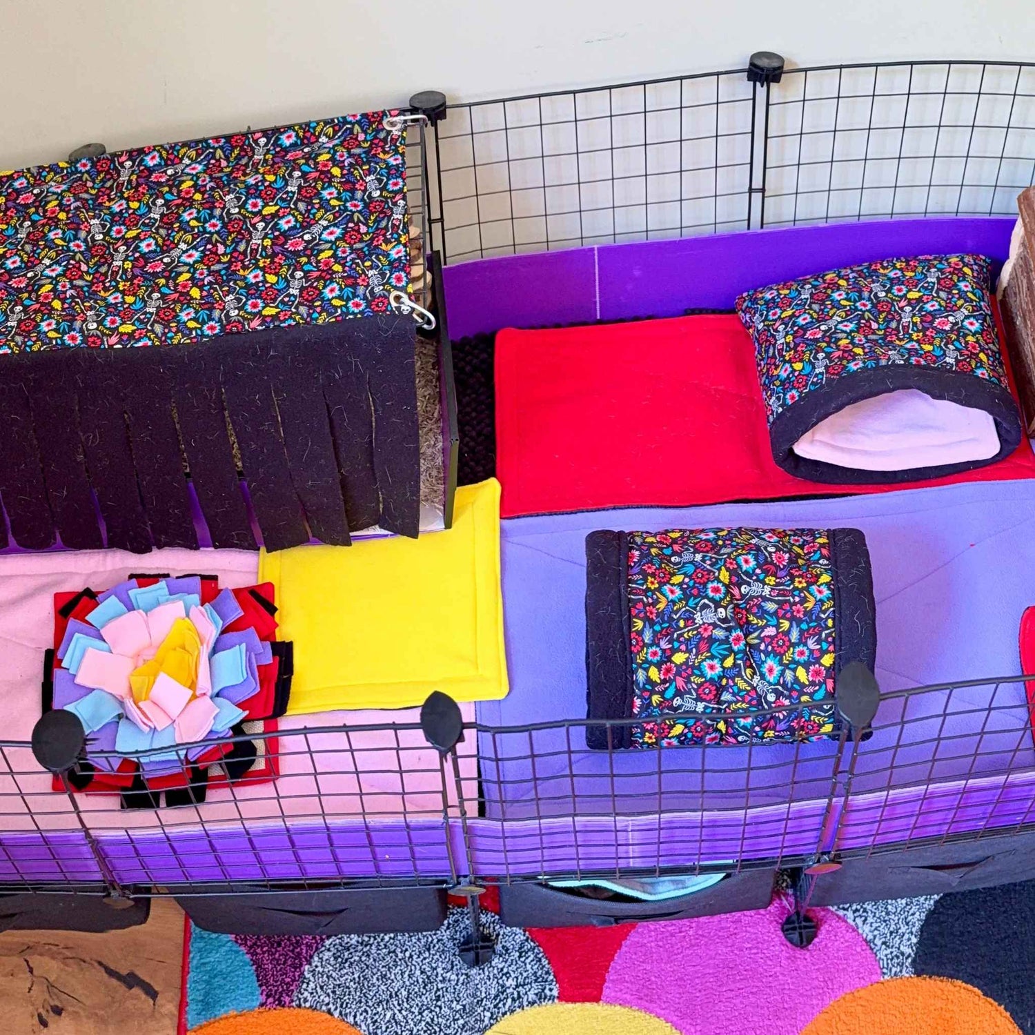 Layered fleece strips in bright colours that match our Frightful Fiesta theme. Underneath, the full rainbow sugar skull fabric brings the carnival vibe to life. Perfect for hiding veggies, pellets, and tasty treats.